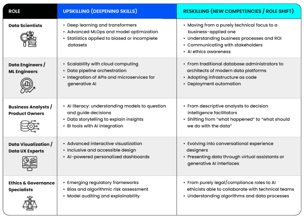 The following table details the upskilling and reskilling required by the different profiles within a data and AI dream team, considering the current demand.